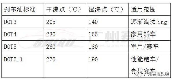 下面是各個標準的剎車油的干濕沸點數據和適用范圍。