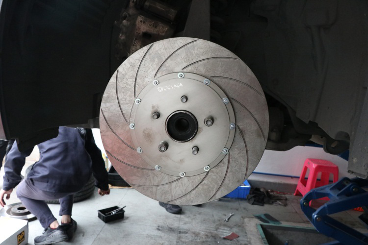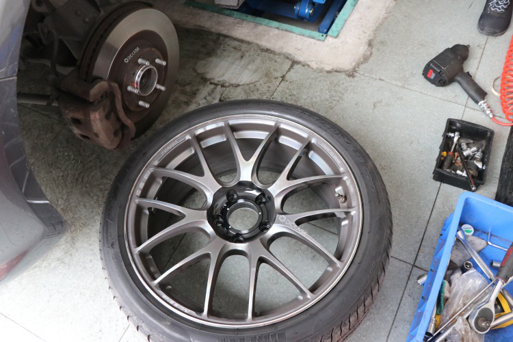 卸下原車的剎車卡鉗和剎車盤后,清理軸面(打磨祛銹,裁剪擋泥板),安裝橋位,然后裝上AP剎車盤。