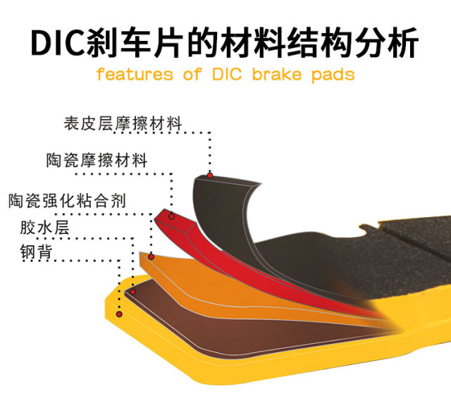 DICASE剎車片的鋼板經(jīng)過特殊涂料涂裝防銹,涂裝過程擁有精準溫度分布來保證質(zhì)量。其中隔熱層是由不傳熱的材料組成,目的是隔熱。摩擦塊由摩擦材料、粘合劑組成。DICASE的摩擦材料是新型復合陶瓷材料,耐高溫,耐磨,而粘合劑是采用新加坡技術的陶瓷粘合劑,更加牢固,耐高溫。