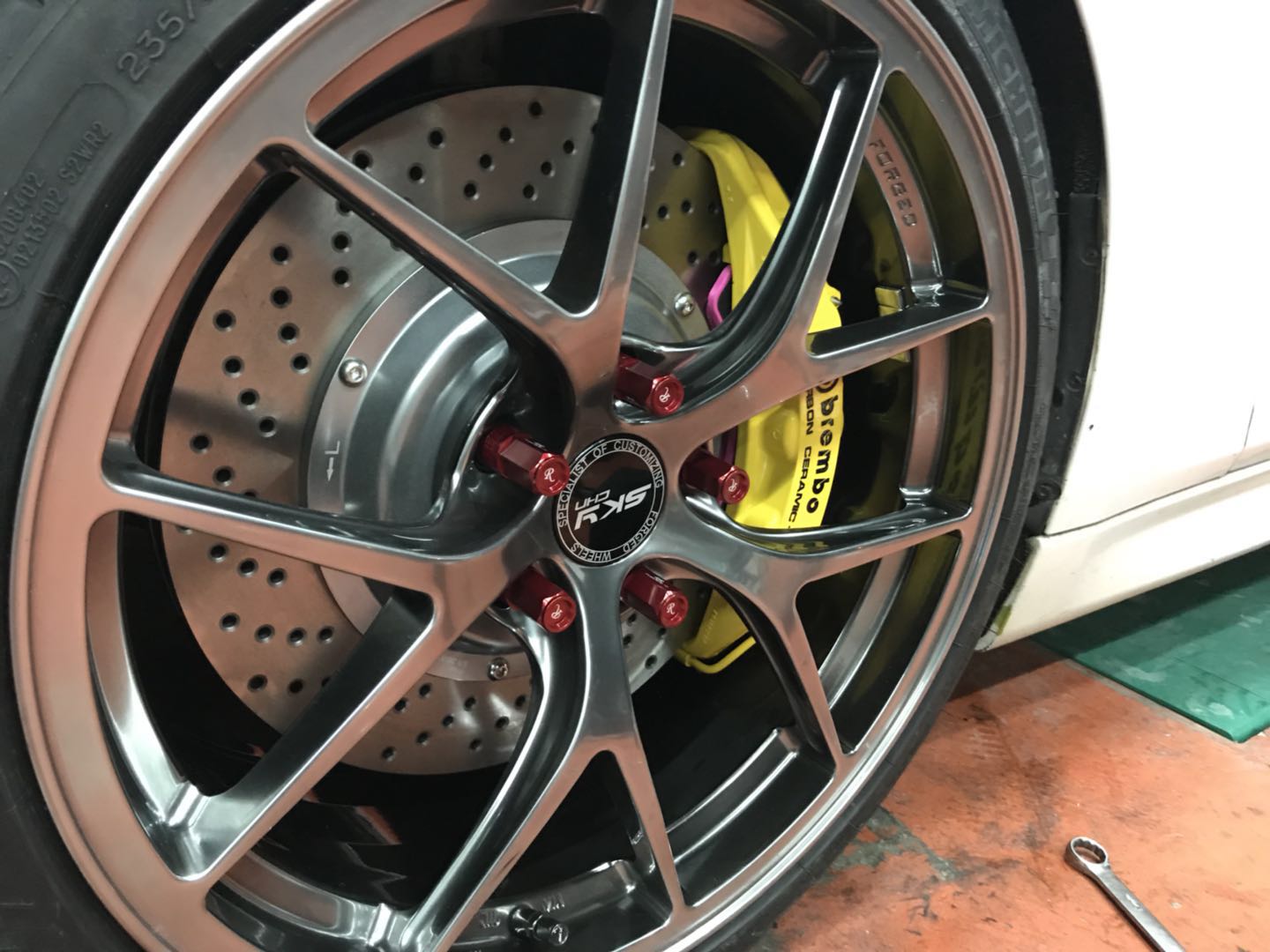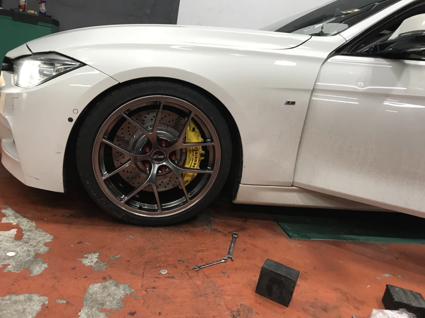 寶馬白色的原廠涂裝,透露出高貴典雅的氣息。Brembo V6+DICASE套件讓它不再沉悶,讓整個輪轂顯得飽滿完美,讓它的外表不再單調。