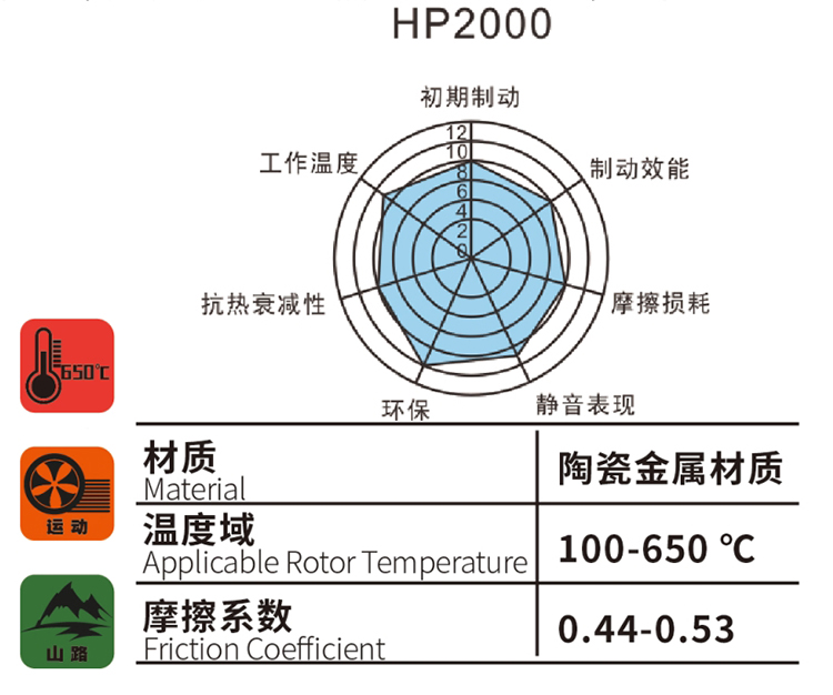 HP2000系列是DICASE針對賽道體驗推出的剎車片,也就是我們通常所說的Track Day。這款剎車片采用陶瓷金屬摩擦材料配方,摩擦系數為0.44-0.53,最佳工作溫度范圍是100-650℃。